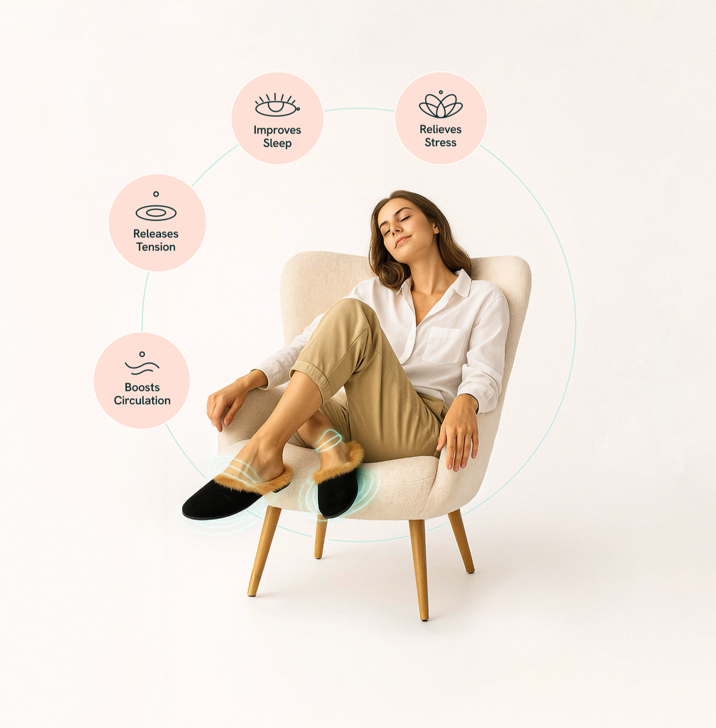 AI guided luxury slippers that support your body’s stress response with gentle, adaptive touch—helping you feel calmer and sleep more deeply.